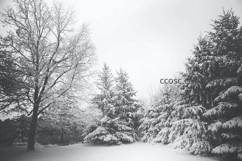 单色调的画面中,枝干嶙峋的落叶树与苍翠的雪松并立,厚厚的积雪覆盖大地与树梢,营造出一种纯粹、静谧而略带忧郁的冬日意境。