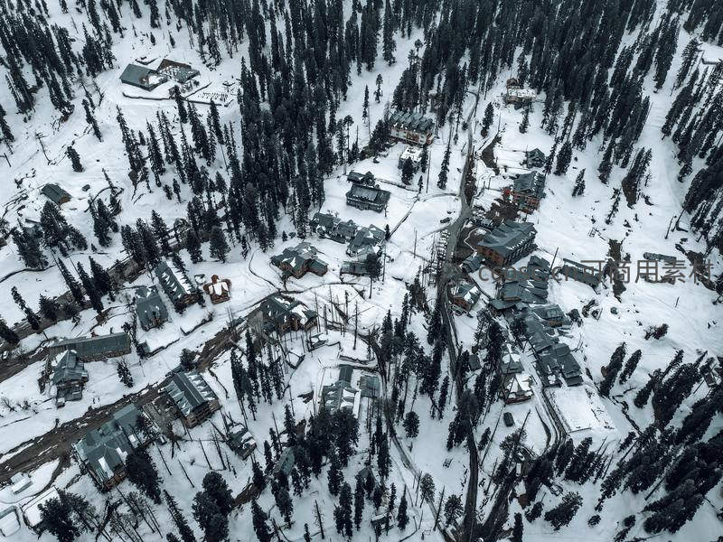 从高空俯瞰,白雪覆盖的山谷中散落着错落有致的木屋,四周密布苍翠松林,宛如童话中的隐世村庄,静谧而安详。