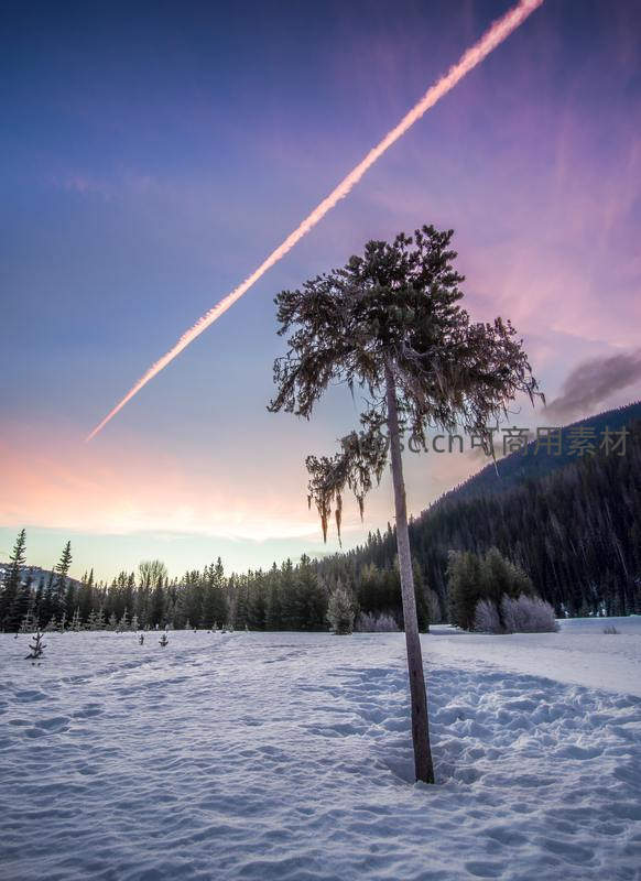 一棵孤树矗立在无垠雪原上,背景是紫粉交织的暮色长空,一道长长的飞机云斜贯天际,意境悠远。