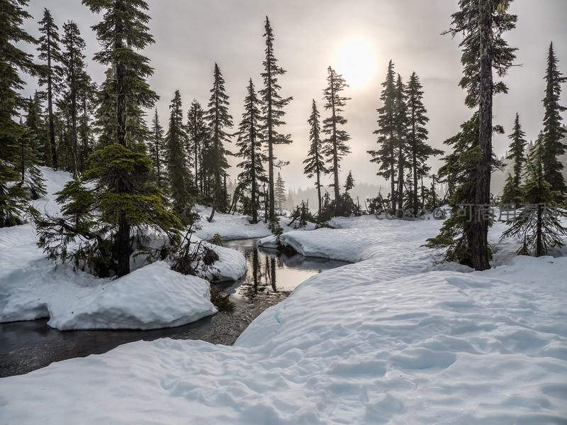 雪林溪流晨曦微光映照树影