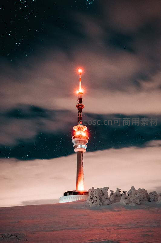 高耸的电视塔在漫天飞雪与星云交织的夜空中亮起红光,塔身被冰雪包裹,宛如科幻场景,展现现代科技与自然奇观的交融。
