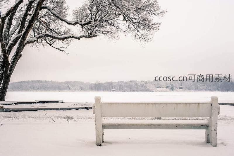 一张被白雪覆盖的白色长椅静置于湖畔,旁边是枝干虬劲的枯树,远处是白茫茫的冰湖和树林,整个画面弥漫着一种空灵而寂寥的美感。