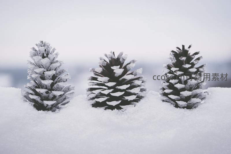 三颗形态各异的松果半埋在蓬松的积雪中,每一片鳞片都点缀着晶莹的雪花,微距镜头捕捉下这冬日里植物细节的精致与生命力。