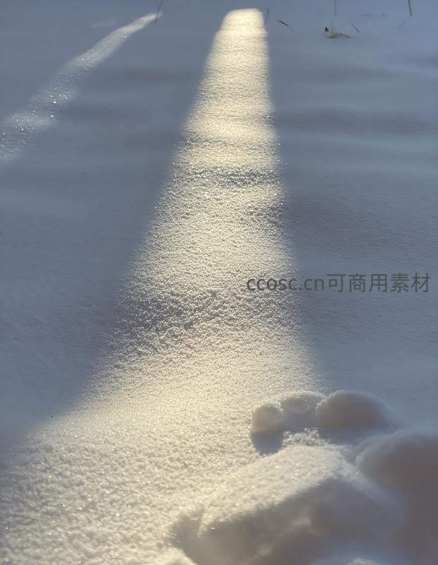 冬日暖阳斜照在洁白的雪地上,形成一道明亮的光带,雪面晶莹闪烁,脚印点缀其间,营造出静谧而温馨的氛围。