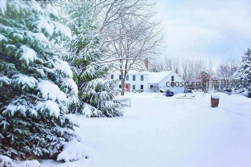 皑皑白雪覆盖了整个乡村,白色房屋与青翠松树相映成趣,院中车辆静默,空气清冷,呈现一幅安详祥和的冬日田园画卷。