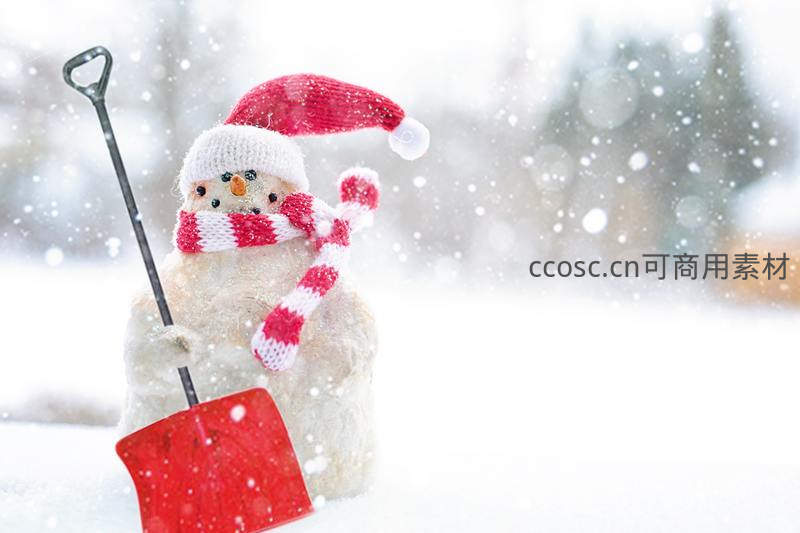 戴着红白圣诞帽、围着条纹围巾的小雪人手持红色小铲,站在飘雪中,神情呆萌,为寒冷冬日增添一抹童趣与节日欢乐气息。