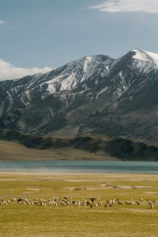 巍峨的雪山倒映在清澈的湖水中,湖畔广阔的草原上,一群羊儿悠闲地低头吃草,构成一幅宁静祥和的高原牧歌图景。