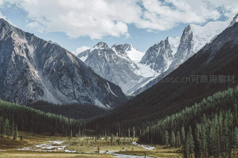 高耸的雪山环抱着深邃的山谷,谷底绿草如茵,松林密布,一条小溪蜿蜒其间,展现原始而壮丽的高山生态景观。