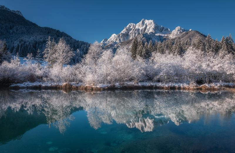 冬日阳光下,霜雪包裹的树木与远山在碧绿湖水中形成完美镜像,天地一色,宁静得仿佛时间凝固。
