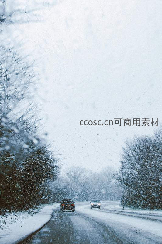 大雪纷飞的冬日,两辆汽车行驶在被积雪覆盖的乡间公路上,道路两旁是静谧的枯树,营造出宁静而略带孤寂的旅途氛围。
