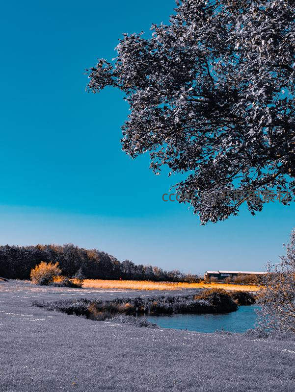 蓝天映衬下,霜枝垂挂田野水塘边