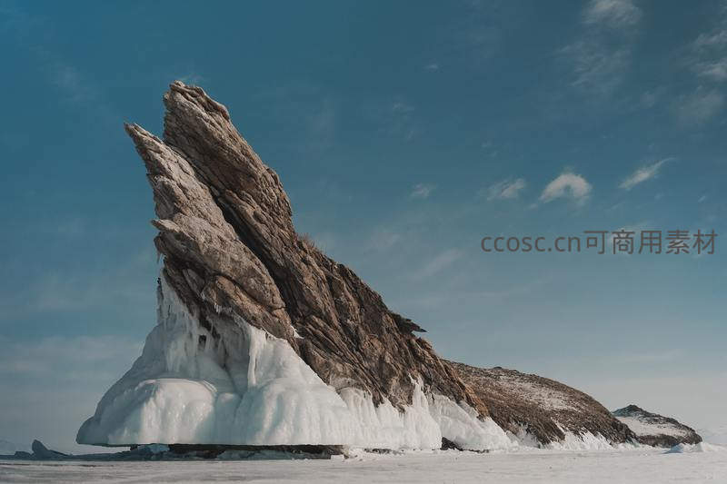 冰封巨岩矗立雪原,蓝天为幕显苍凉
