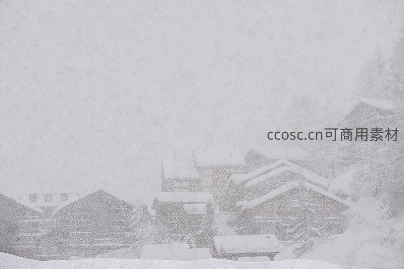 大雪纷飞,能见度极低,远处的木屋群在风雪中若隐若现,屋顶堆满厚雪,整个世界被白色笼罩,传递出严冬的凛冽与苍茫。