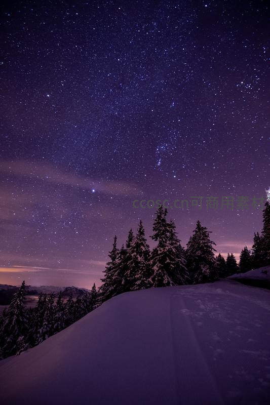 深邃夜空繁星点点,紫色天幕下覆盖白雪的松林静立山巅,雪地反射微光,营造出梦幻而安宁的冬夜氛围。