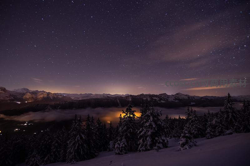 高海拔视角俯瞰云海翻腾,远处山峦轮廓在星光与灯火映衬下若隐若现,近处雪松如哨兵守护着这片静谧的星空秘境。