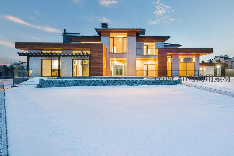 现代设计感别墅在皑皑白雪中熠熠生辉,大面积玻璃窗透出暖黄灯光,与冷色调雪地形成鲜明对比,展现奢华与温馨并存的生活空间。