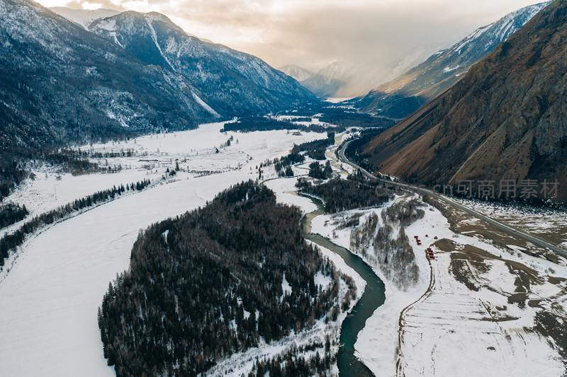 无人机视角下,雪原、森林与蜿蜒公路交织成画,远处山峦层叠,近处河流如墨,尽显冬日峡谷的辽阔与诗意。