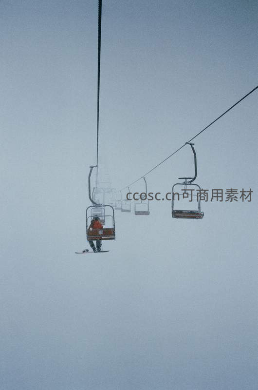 一名身着橙衣的滑雪者乘缆车缓缓上升,四周雾气弥漫,背景空旷,营造出静谧而专注的冬日运动氛围。