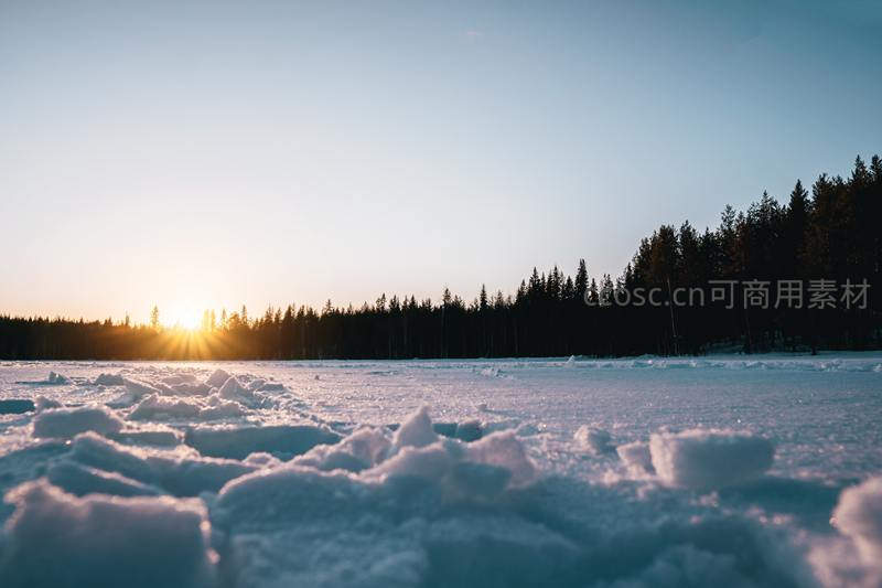 低角度拍摄冰封湖面,阳光穿透松林形成耀眼星芒,雪堆起伏,远山静默,营造出宁静致远的冬日黄昏意境。