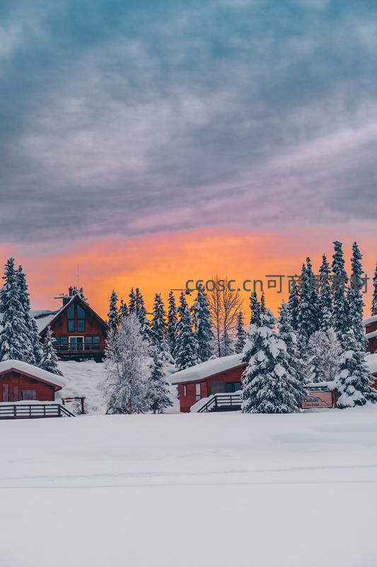 夕阳西下,橙粉晚霞染透天际,雪覆的木质房屋与挺拔松林静谧伫立,大地洁白如毯,构成一幅童话般的北欧冬日画卷。