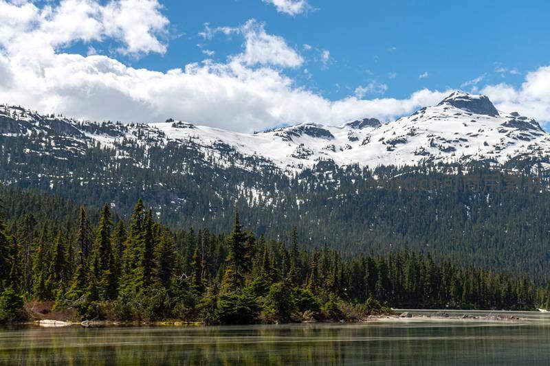 清澈的湖水映照着远处白雪皑皑的山峰和茂密的针叶林,蓝天白云下构成一幅宁静和谐的自然画卷。