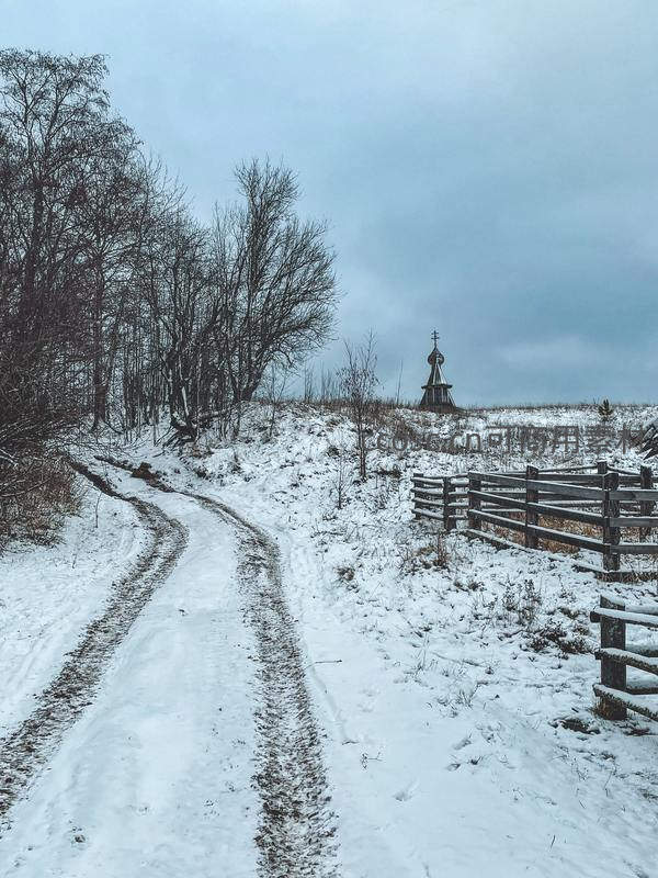 一条被车辙印刻的雪路蜿蜒伸向远方,尽头是孤寂的小教堂,在光秃树木与灰云映衬下更显肃穆与诗意。