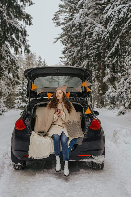一位年轻女子坐在打开的车尾箱上,手持热饮,身披毛毯,背景是雪松林,享受着自驾旅行中的悠闲冬日午后。