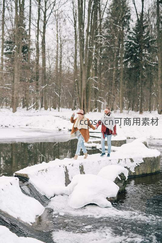 一对情侣手牵着手,在覆盖着厚厚积雪的石桥上小心行走,脚下溪水潺潺,四周是光秃的树林,充满冬日野趣。