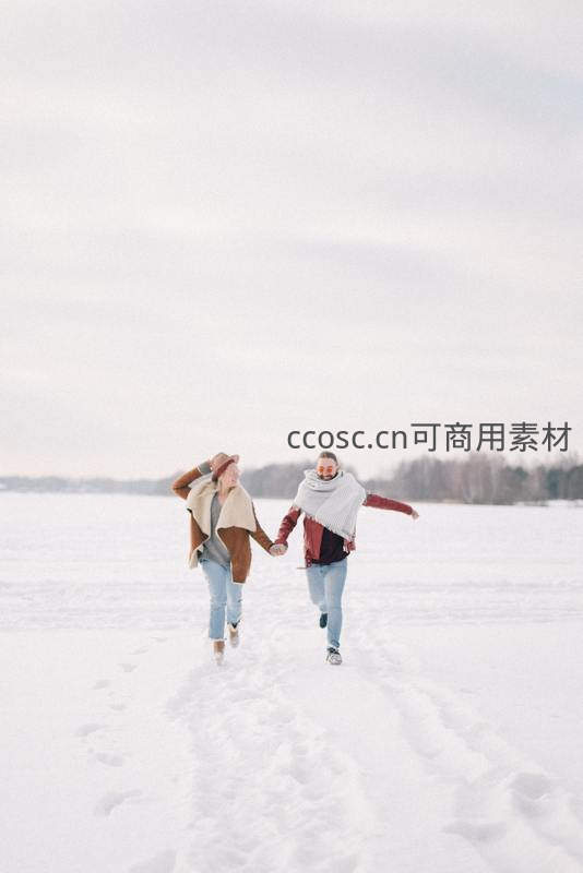 一对恋人在一望无际的雪原上手拉手欢快奔跑,身后留下清晰脚印,天空开阔,尽显无拘无束的甜蜜与活力。