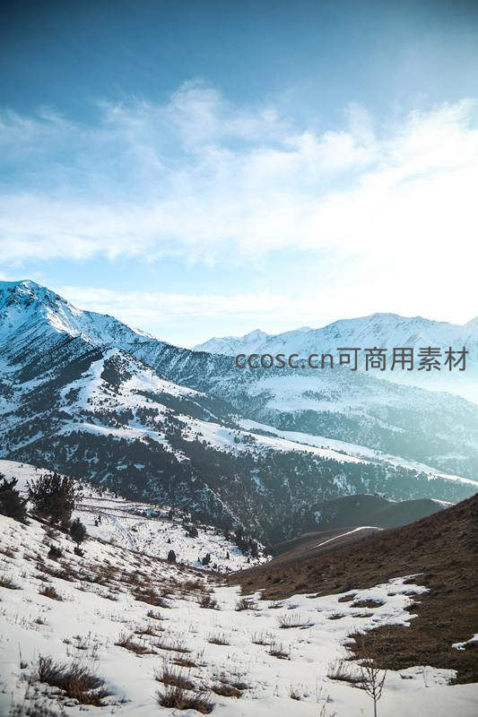 连绵的雪山在晴朗天空下闪耀,山谷间积雪与裸露山体交错,阳光穿透云层洒向大地,展现大自然的雄伟与宁静。