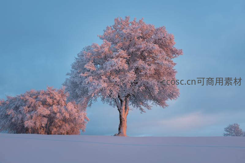 晨曦中霜覆孤树的静谧雪景