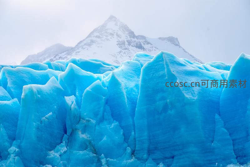 晶莹剔透的蓝色冰川层叠起伏,背景雪山隐现于薄雾之中,展现出大自然鬼斧神工的壮美与神秘。