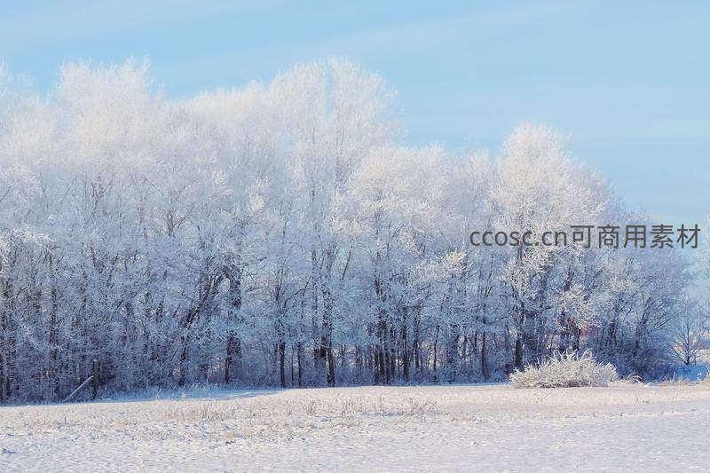 阳光下,整片树林被晶莹剔透的雾凇包裹,枝头挂满霜花,雪地空旷无垠,营造出如梦似幻的冬日仙境氛围。