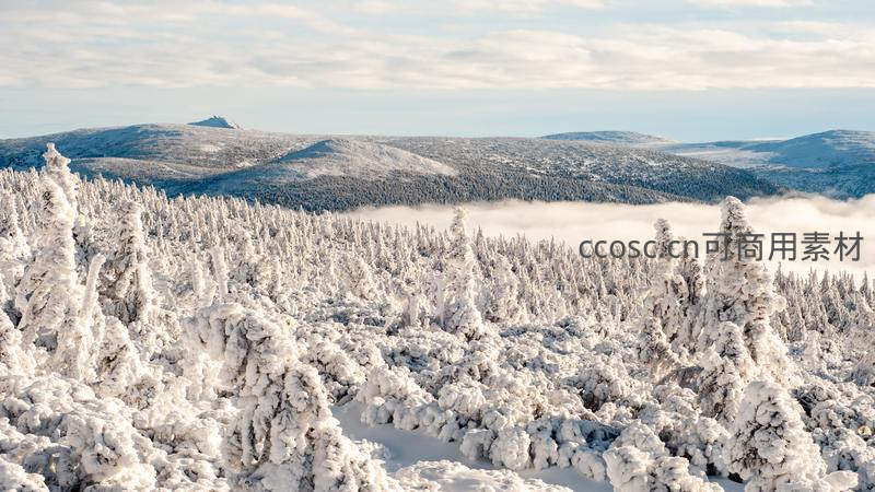 从高空俯瞰,连绵起伏的山脉被厚厚的积雪覆盖,成片的松林宛如玉树琼枝,山谷间云雾缭绕,仿佛置身仙境,气势恢宏,纯净无瑕。