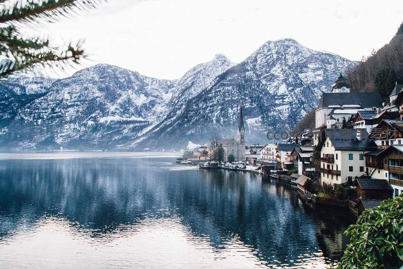 宁静的湖水映照着被白雪覆盖的群山和沿岸的古老村庄,一座高耸的教堂尖塔成为视觉焦点,整体画面安详唯美,如油画般动人。