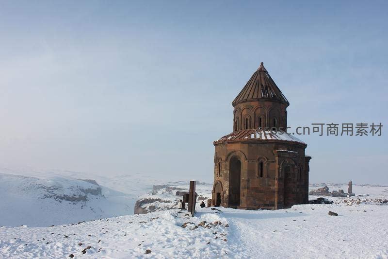 一座古老的石质教堂矗立在白雪覆盖的山顶,四周是苍茫的雪原和淡蓝色的天空,展现出宁静而庄严的冬日景象。