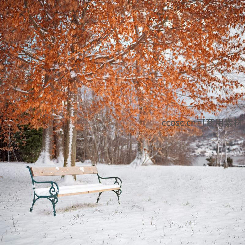 雪后公园里,一张空置长椅静静伫立,头顶是尚未落尽的橙红树叶,脚下是洁白新雪,构成一幅秋与冬交替时分的诗意静谧画面。