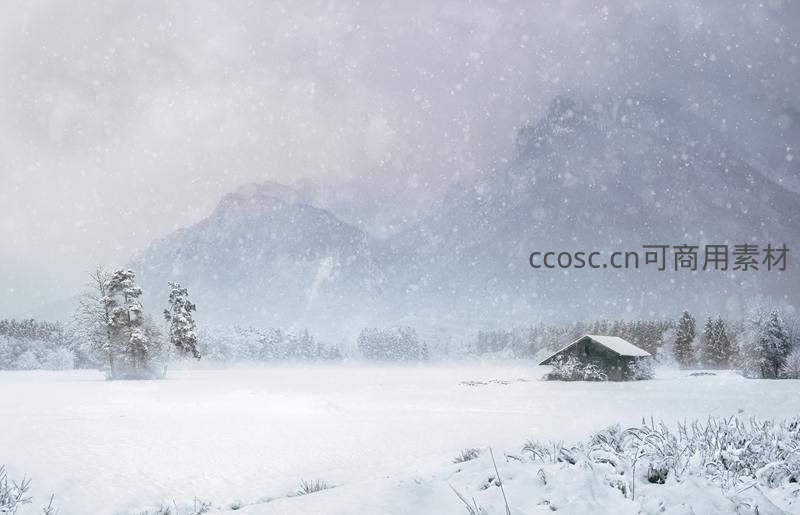 雪山脚下小屋,风雪弥漫的冬日仙境