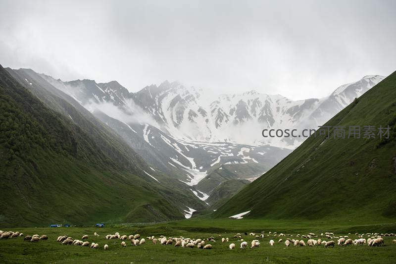 巍峨雪山环抱翠绿山谷,成群绵羊在丰茂草地上悠闲觅食,云雾缭绕山腰,构成一幅宁静祥和的高原牧歌图景。