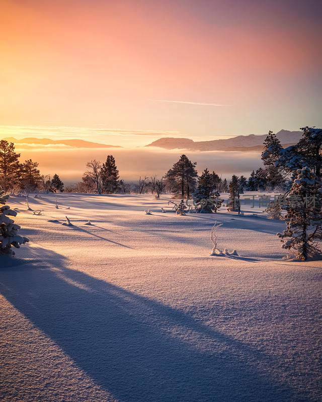 粉橙色朝霞染遍天际,阳光为雪原披上金纱,远山隐于云海之中,近处松树投下长长阴影,尽显冬日恢弘之美。