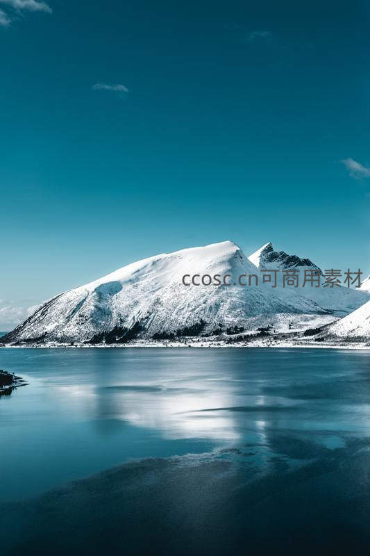 湛蓝天空下,皑皑雪山巍然耸立,平静湖面如镜般倒映着山峰轮廓,营造出空灵纯净、远离尘嚣的北欧极地意境。