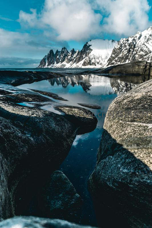 从巨大岩石缝隙中仰望,远处雪峰与天空的倒影在静水池中清晰可见,构图独特,仿佛发现一处被遗忘的自然秘境。