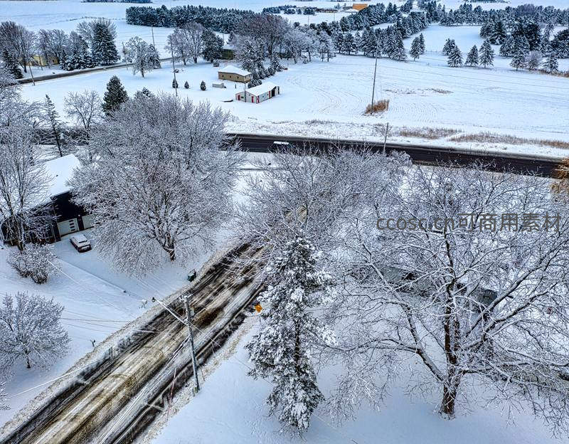 航拍视角展现被白雪覆盖的乡村景象,蜿蜒公路穿过田野与树林,几处农舍点缀其间,车辙印迹清晰可见,呈现宁静祥和的冬日田园风貌。