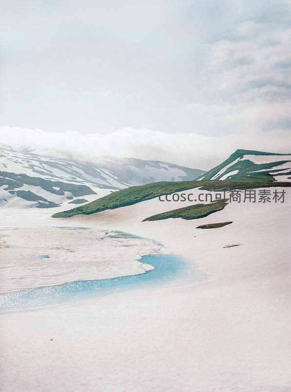 高海拔雪原上,一条清澈的蓝色溪流蜿蜒流淌,融化的雪水冲刷出优美的曲线,零星的绿色植被从积雪中探出,与远山云雾相映成趣。