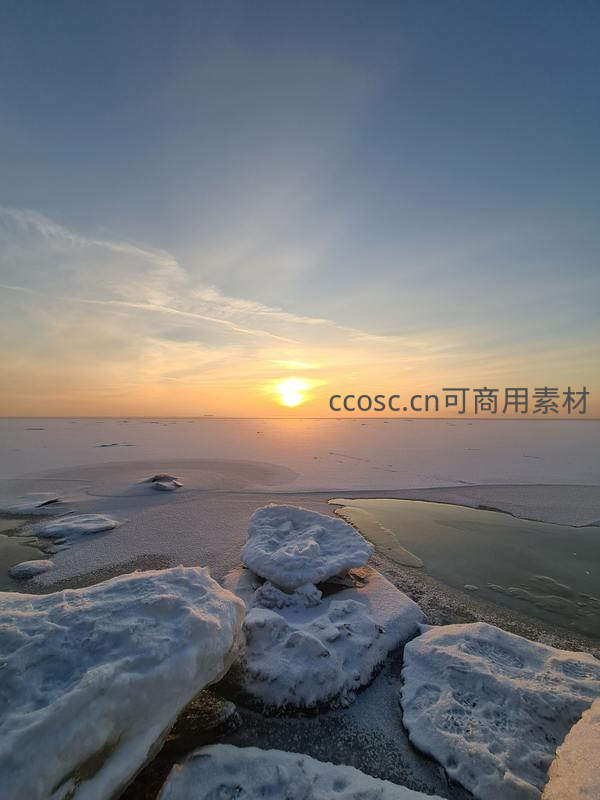 夕阳缓缓沉入冰封的湖面,金色光芒映照在浮冰与积雪上,天空渐变色彩与大地静谧交融,呈现冬日黄昏的诗意之美。