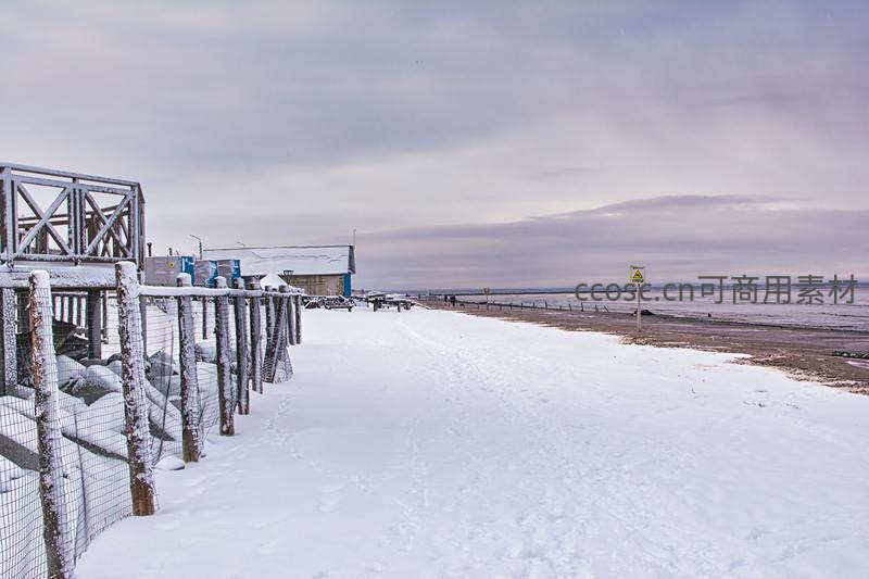 一条被白雪覆盖的小径沿着海岸延伸,木制围栏和远处建筑在灰蓝天空下显得格外寂寥,展现北方海滨冬日的独特苍凉。