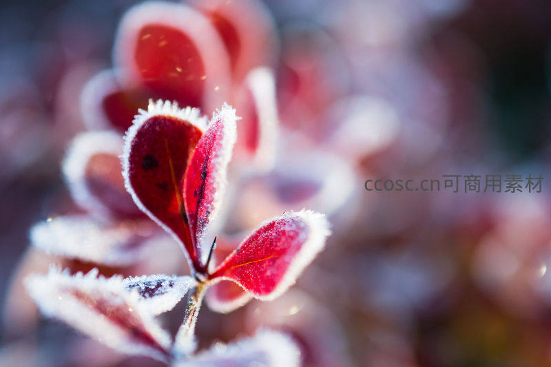 深红色的叶片边缘被一层薄霜包裹,晶莹剔透的冰晶勾勒出叶片轮廓,在柔和光线下散发出温暖而静谧的冬日氛围。