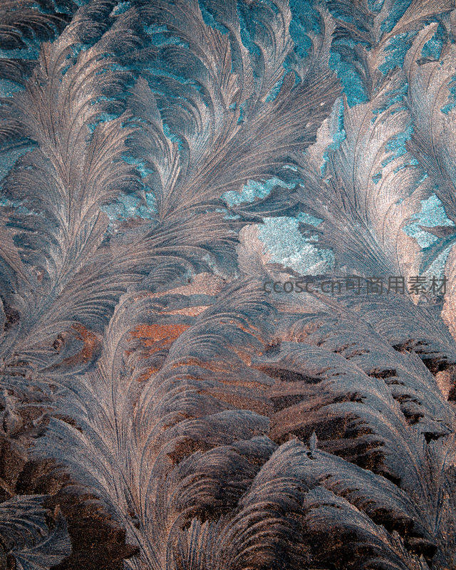 冰霜在玻璃上生长出如羽毛般层叠、流畅的纹理,深蓝与浅棕的色彩交织,形成一幅充满动感与韵律的天然抽象画,令人惊叹于自然造物的鬼斧神工。