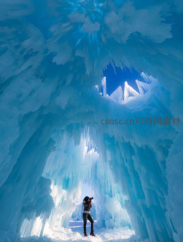 一位游客站在巨大的天然冰洞内,仰望由冰层和冰柱构成的壮丽穹顶,阳光穿透冰体洒下梦幻般的蓝色光芒,令人叹为观止。