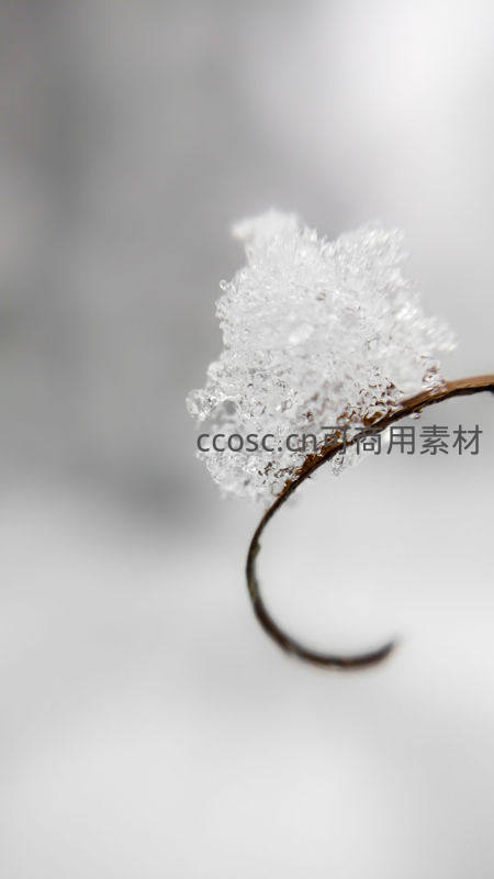 一根弯曲的枯枝末端托着一小簇蓬松的雪花,背景虚化成一片柔和的灰白,突显了雪花晶体的精致结构与冬日的宁静之美。